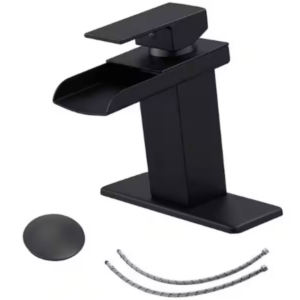 FLG LE-0200-MB Single-Handle Single-Hole Brass Waterfall Bathroom Sink Faucet with Pop Up Drain Kit and Deckplate in Matte Black