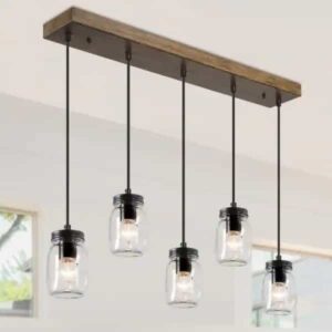 Uolfin A7Y7VFHD23709VZ Modern Mason Jar Chandelier Light Firefly 5-Light Black Linear Island Pendant Light with Rustic Faux Wood Accent