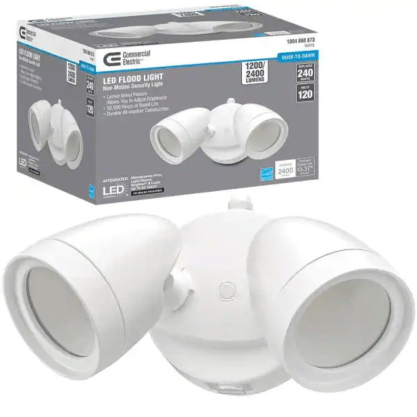 The Commercial Electric 51405192 Dusk to Dawn Lumen Boost White Outdoor Integrated Twin Head LED Flood Light Security Light is a powerful and energy-efficient lighting solution for outdoor security and general lighting. This flood light features a twin head design and an integrated photocell sensor that automatically turns the light on at dusk and off at dawn. The light has a color temperature of 4000K, which is a cool white light that provides bright and efficient lighting for your outdoor spaces.