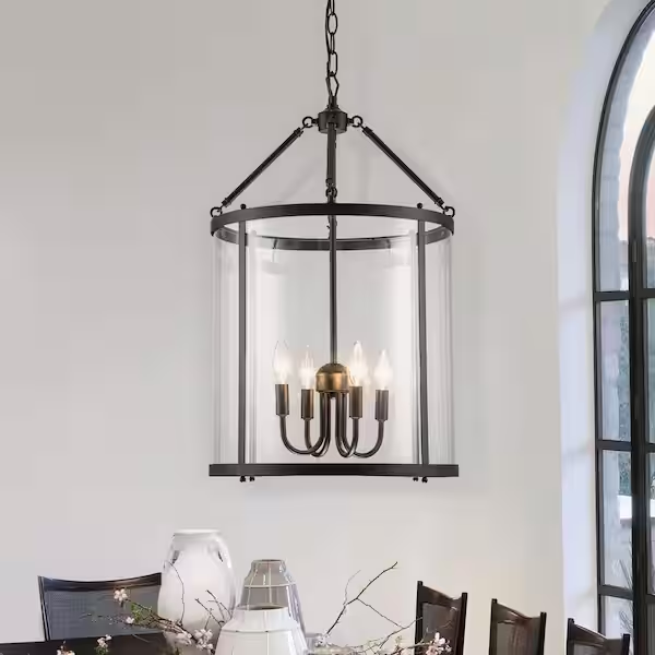 A simple lantern-style drum shaped housing around 4 hanging lamp holders. With an open cage fusing clear glass and sleek metal to bring elegant charm to any space. Comes with 70.9 in. (maximum) chain, you can DIY the length of the chain to fit just about any height ceiling.
