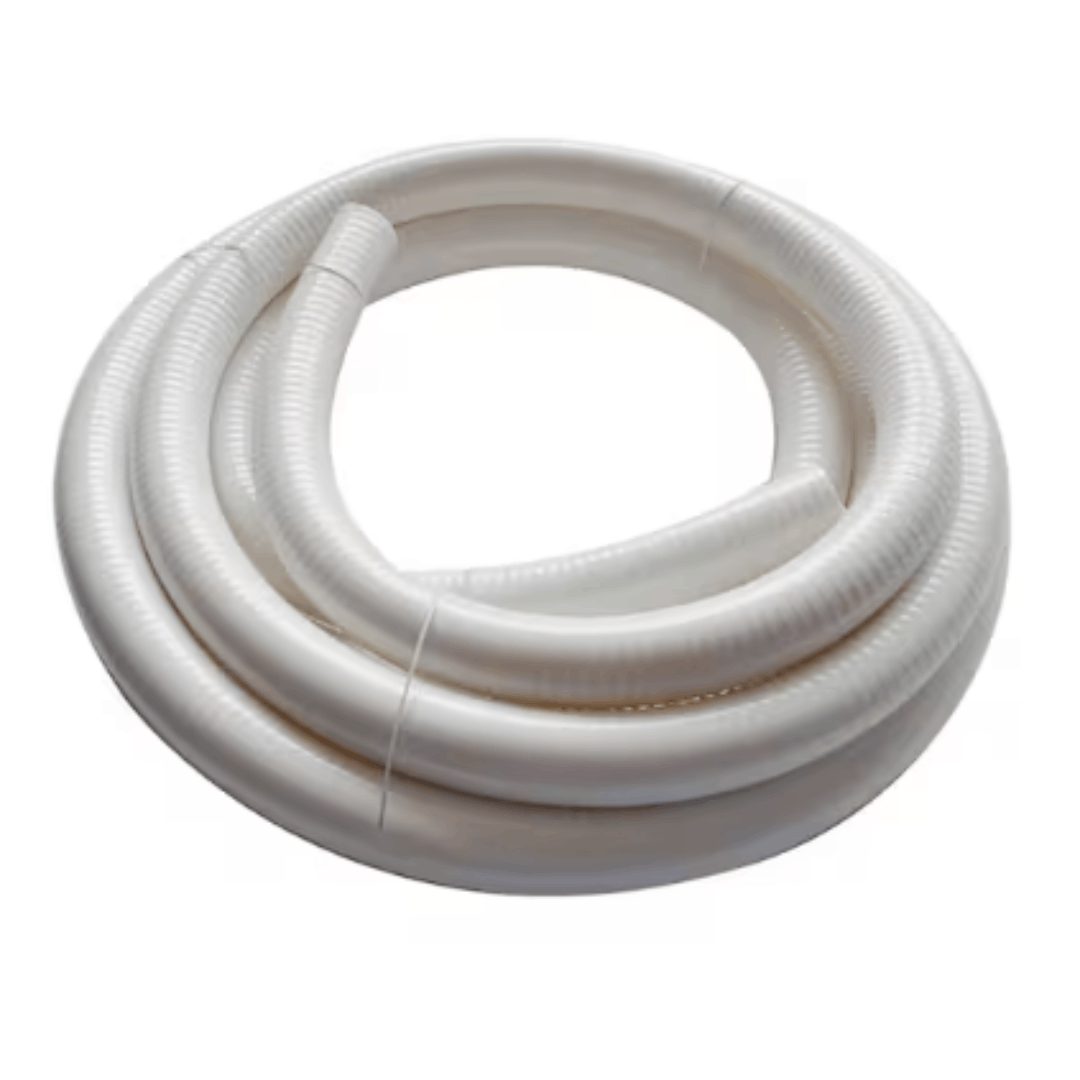 This flexible spa hose offers durable yet pliable tubing that’s easy to maneuver. Its ability to bend and conform to various shapes makes it highly versatile. Built with a reinforced rigid PVC spiral helix, it performs well as a light suction or vacuum discharge hose.