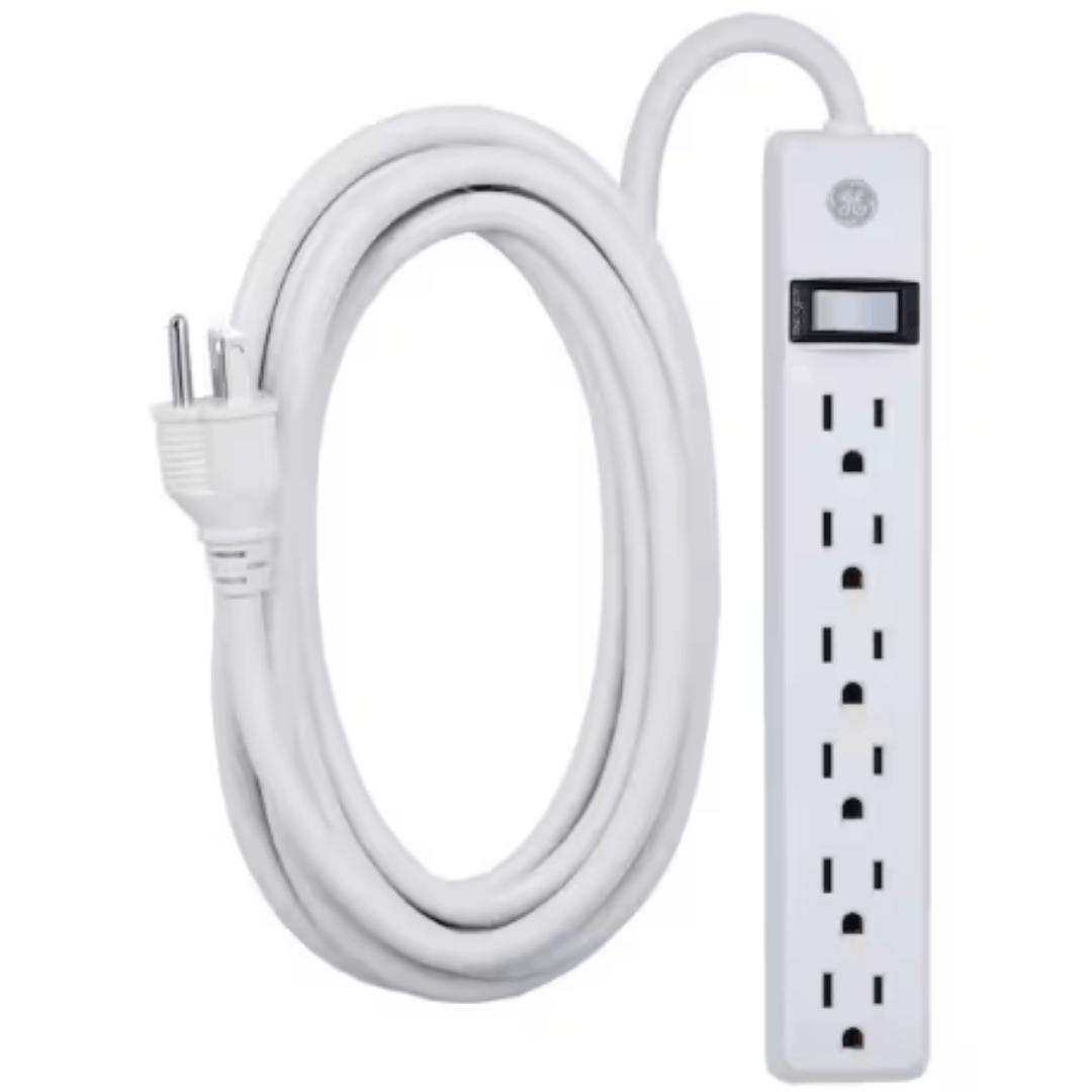 The GE 6-Outlet Power Strip with a 12 ft. extension cord provides a convenient way to expand your outlet capacity while keeping your devices powered. Its six grounded outlets allow multiple electronics to be connected simultaneously, and the extra-long, tangle-free cord offers flexible placement. Designed for safety, it features an integrated circuit breaker to protect against overloads and a built-in ON/OFF switch for easy control. Its slim profile makes it easy to place behind or under furniture, and keyhole slots on the back enable hassle-free wall mounting.
