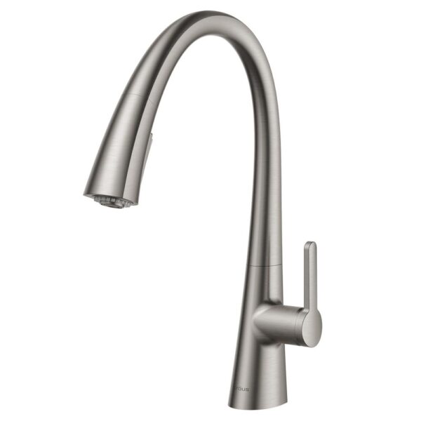 Transform your kitchen with the sweeping lines and soft curves of the eye-catching Nolen faucet. The contemporary design of this pull-down faucet features a dual-function spray head with rocker switch, allowing you to easily switch between aerated stream and powerful rinsing spray. A flexible nylon hose with swivel adaptor offers unparalleled range of motion and effortless movement all around the sink. Soft rubber nozzles make the spray face easy to clean and maintain a lasting powerful flow. An optional deck plate (included with purchase) allows you to install this single handle faucet with a 1, 2, or 3-hole sink. Available in all-Brite Spot Free Stainless Steel finish, which helps to prevent fingerprints and requires less cleaning.