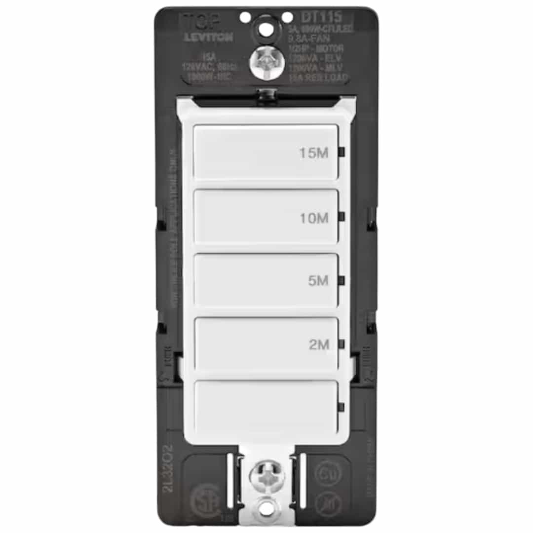 Upgrade your lighting control with the Decora 15-Amp Indoor In-Wall Countdown Timer, ideal for pantries, closets, or other small spaces. This timer features four preset durations from 2 to 15 minutes, automatically turning off lights or fans to save energy and prevent them from being left on. Its compact, shallow design allows easy installation into most wallboxes with lead terminal wires. Simplify your routines and enjoy hands-free operation with this easy-to-use countdown timer.
