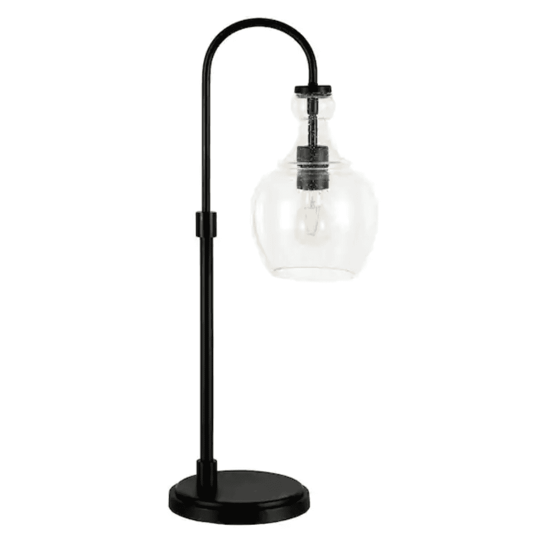 Enhance your reading nook or home office with this stylish 27 in. Mid-Century Farmhouse Table Lamp. Its arced design provides focused, targeted lighting, while the neutral metallic finish and glass dome shade create a warm, inviting glow. This lamp blends function and form, making it a perfect addition to your bedside or desk.