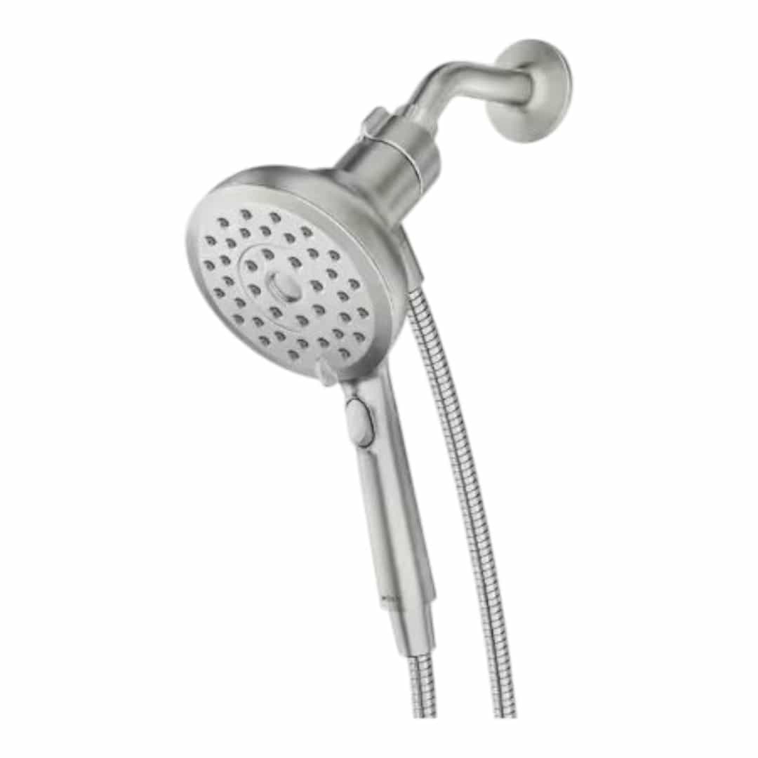 This handheld shower system features a streamlined design and an adjustable dial that enables seamless transition between spray modes. The unit includes four pre-set spray settings, a pause/trickle control for temporary water flow interruption, and a kink-free metal hose for extended reach. The magnetic docking system allows for easy detachment and secure reattachment. Select components incorporate recycled materials for added sustainability.
