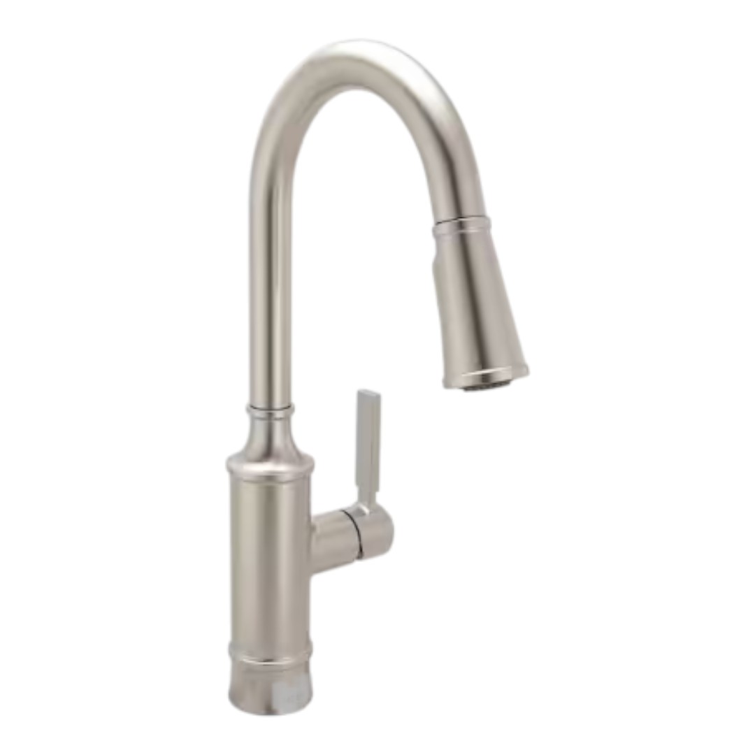 Blending classic and modern design elements, this pulldown kitchen faucet offers a refined take on traditional styling. Its clean, cylindrical body adds elegance to any kitchen setting. The pulldown spout enhances maneuverability, while an integrated return system ensures the spray wand docks smoothly after use. The four-function spray wand includes a high-performance boost feature for faster filling and cleaning. The faucet can be installed with or without the included deck plate, offering flexibility for different sink configurations. The spot-resistant stainless finish provides a brushed look that minimizes fingerprints and water spots.