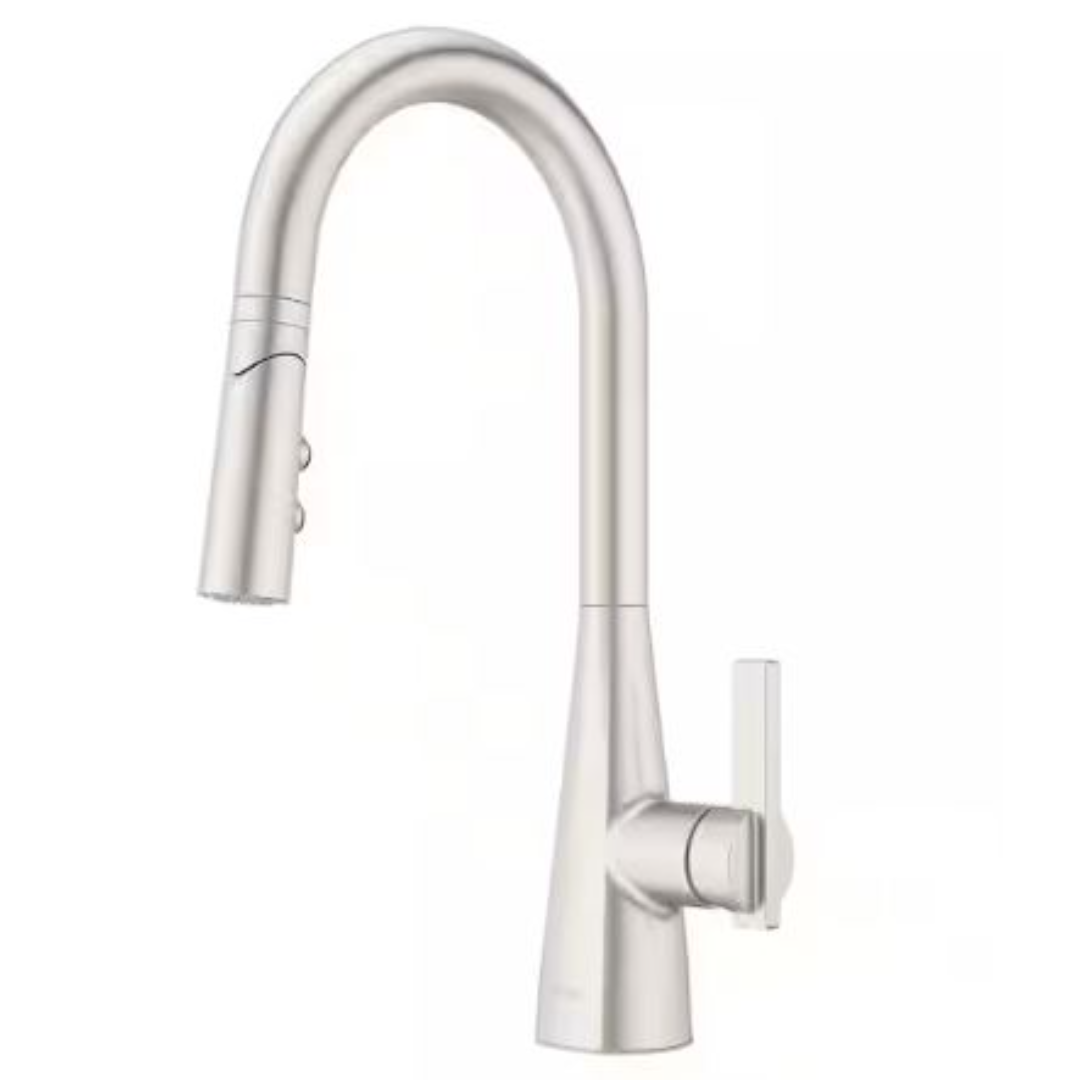 Pull-down sprayer: Includes an advanced docking system, ergonomic forward handle design, and decorative deck plate
