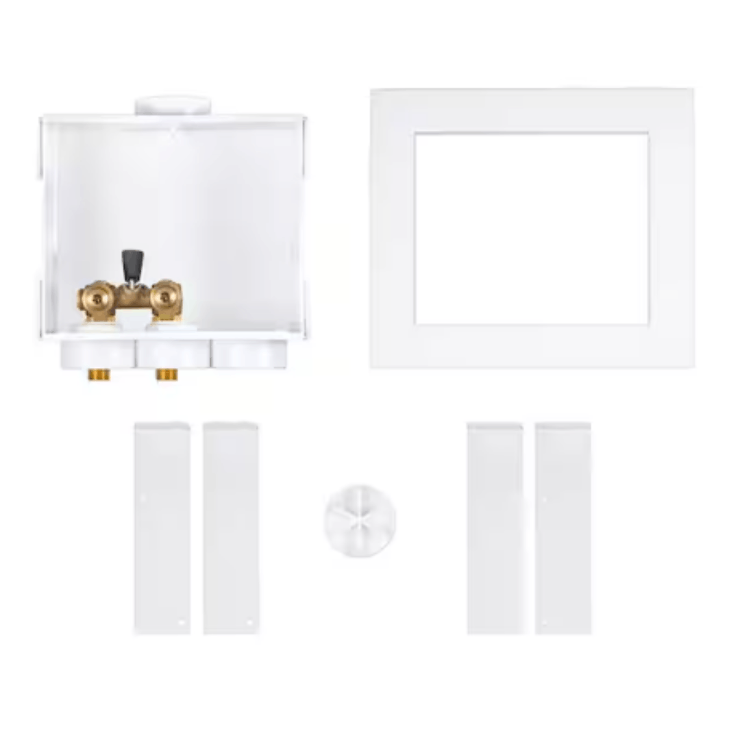 The Oatey Quadtro Washing Machine Outlet Box is designed for both residential and commercial use where recessed supply valves and waste drains are required. Its adjustable valve positioning allows for left, right, or center drain pipe alignment using the proprietary lock-and-load single-lever valve. The box is constructed from high-impact polystyrene for durability and includes all necessary support brackets for flexible top or bottom valve installation.